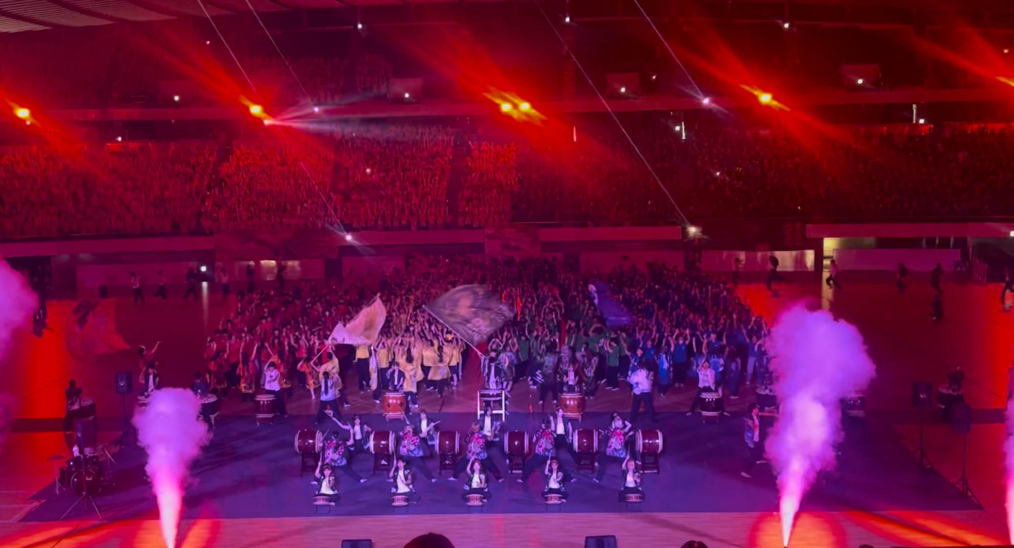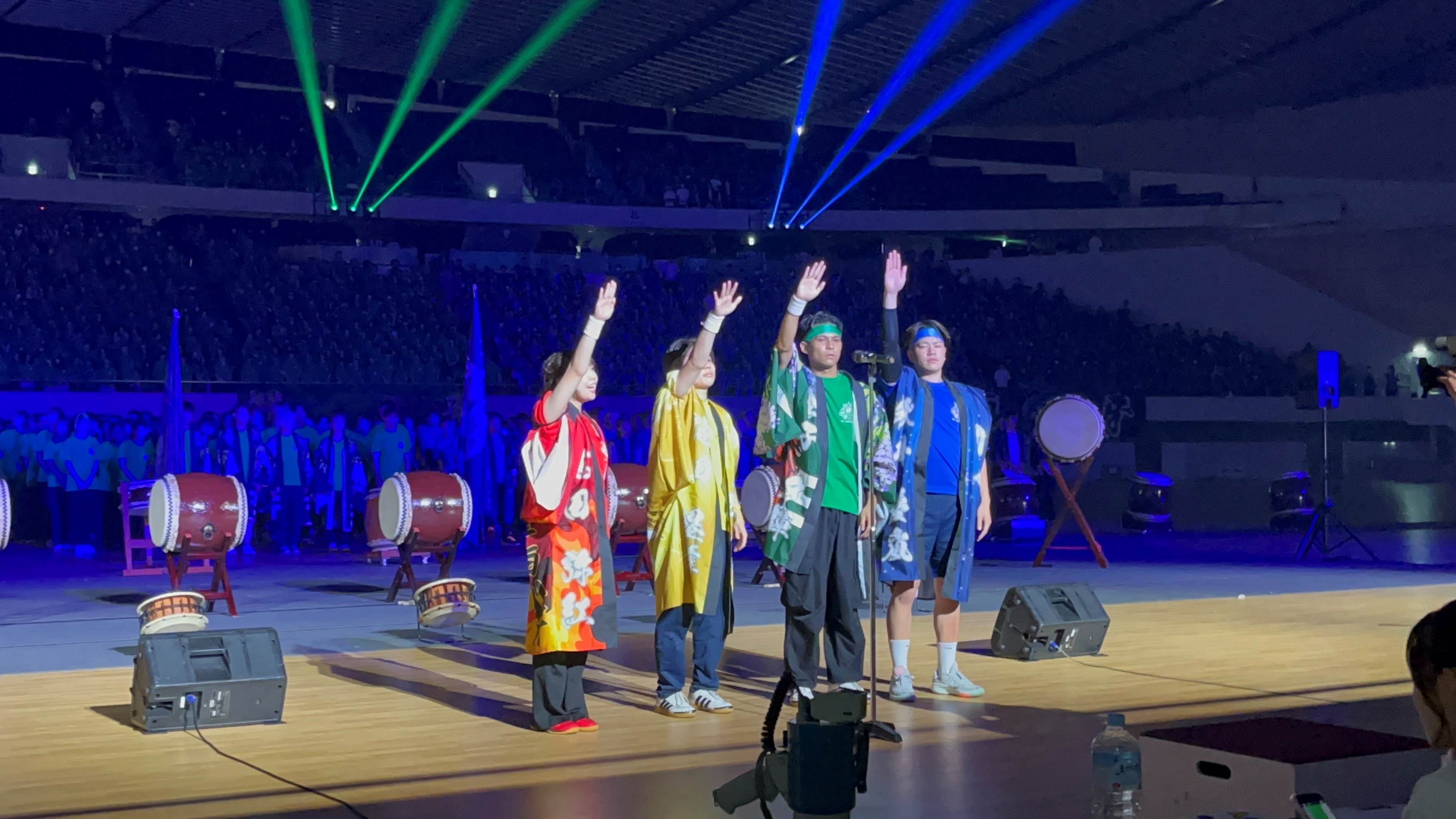 そのまま開会式の流れに移り、出場選手・団長副団長は「わっしょい!」の掛け声とともに入場し、生徒・来場者が一体感に包まれ、会場は最高の盛り上がりを見せました。