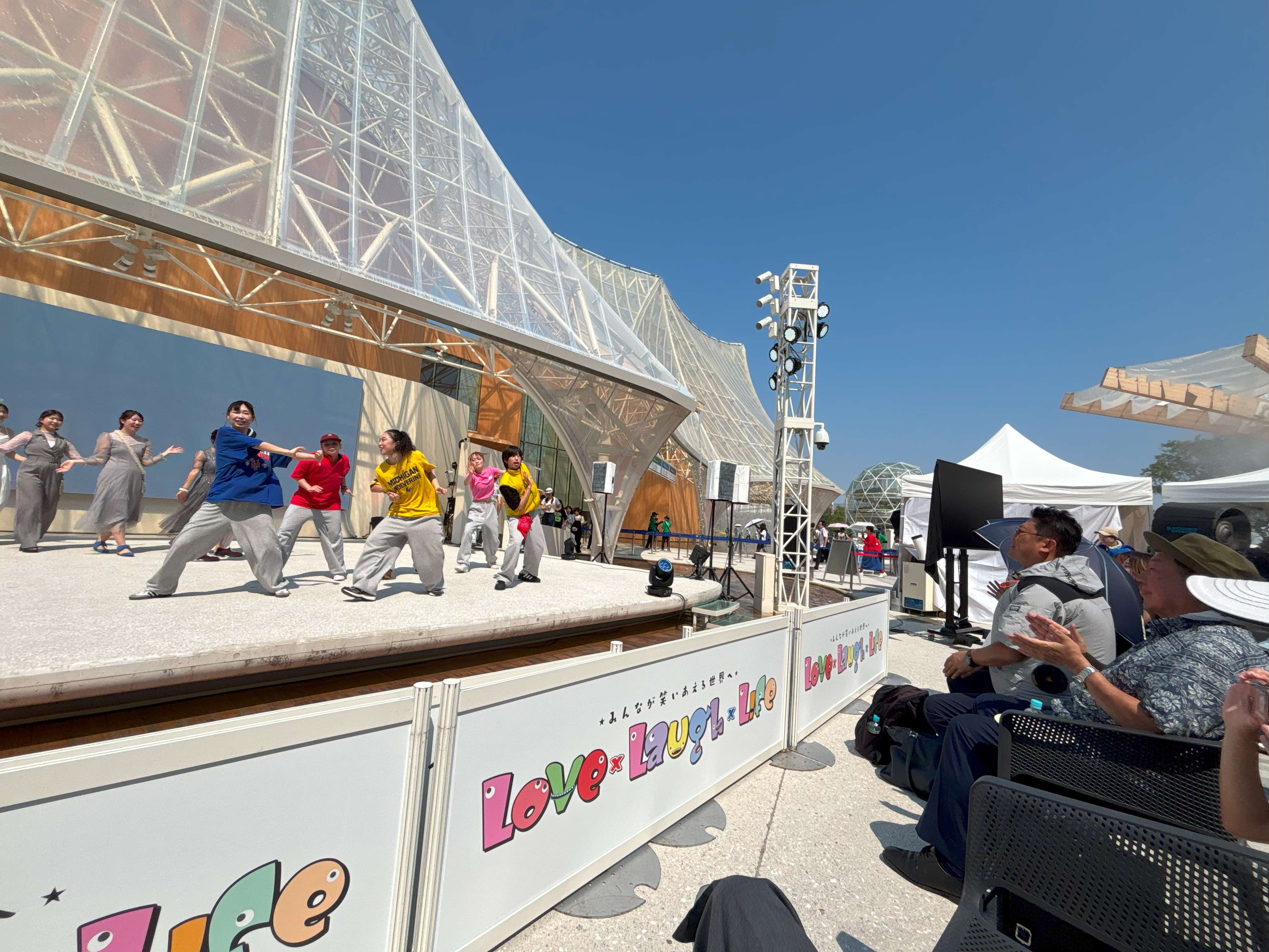そして昼間さんや鳥居さん方々が日陰もないアツアツのお席に着席されいよいよ本番!ステージ周りのキッチンカーやパビリオンに並ぶ人たちの目線を、大屋根リングの下や上を行き来していた人たちの足を、万博テーマソングとともに踊り始めたリゾスポダンスコースの躍動感と主役の演技が引き止めました!